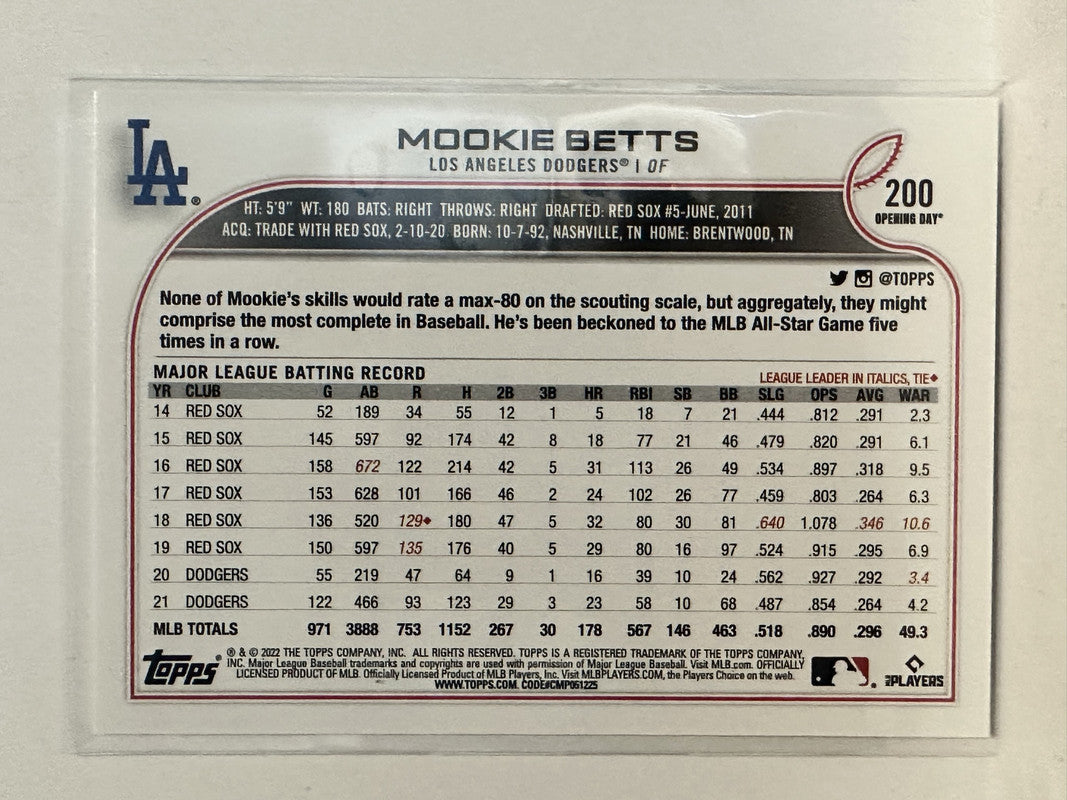 #200 Mookie Betts Los Angeles Dodgers 2022 Topps Opening Day Baseball Card