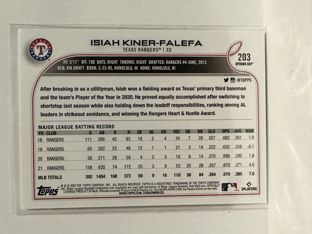 #203 Isiah Kiner-Falefa Texas Rangers 2022 Topps Opening Day Baseball Card