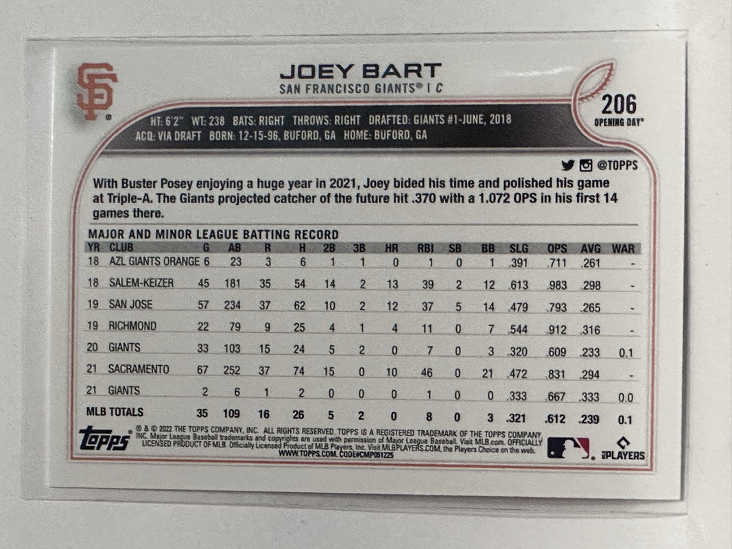 #206 Joey Bart Future Stars San Francisco Giants 2022 Topps Opening Day Baseball Card