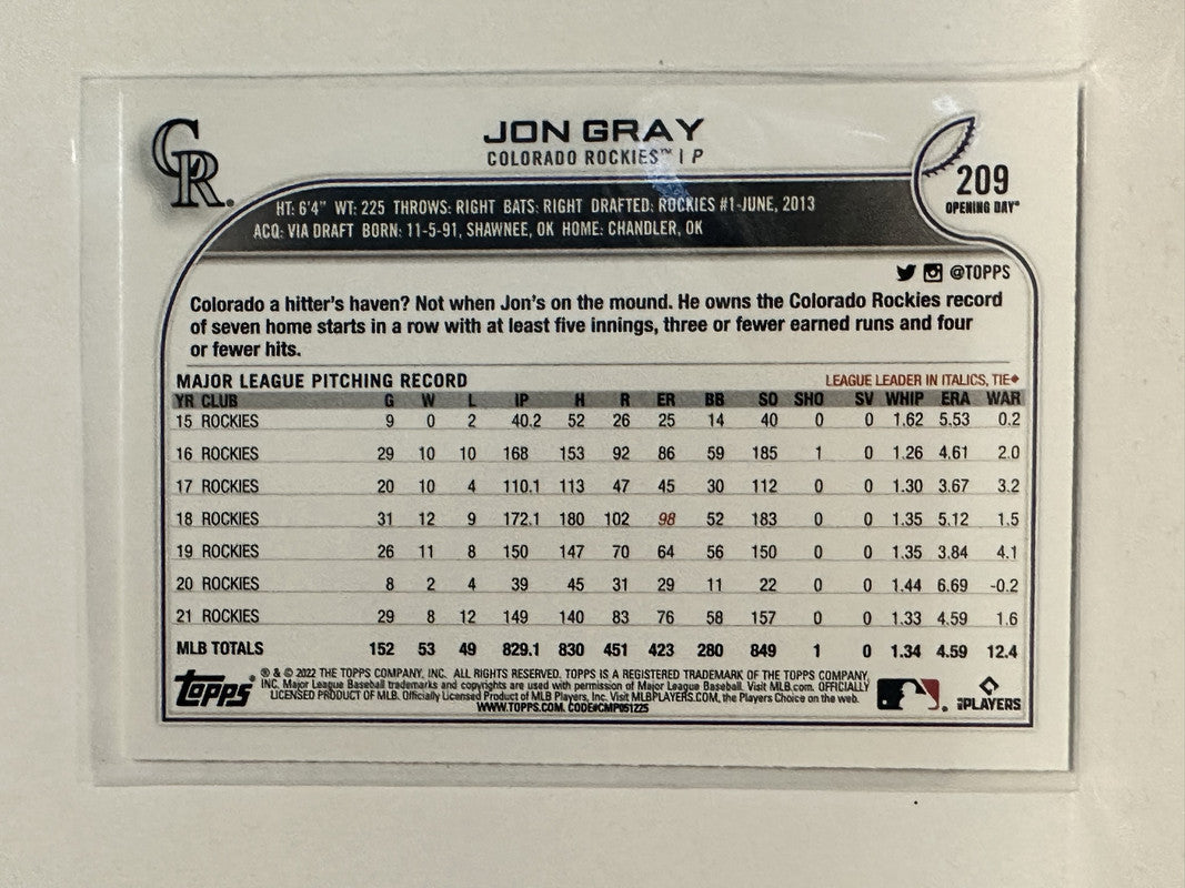 #209 Jon Gray Colorado Rockies 2022 Topps Opening Day Baseball Card