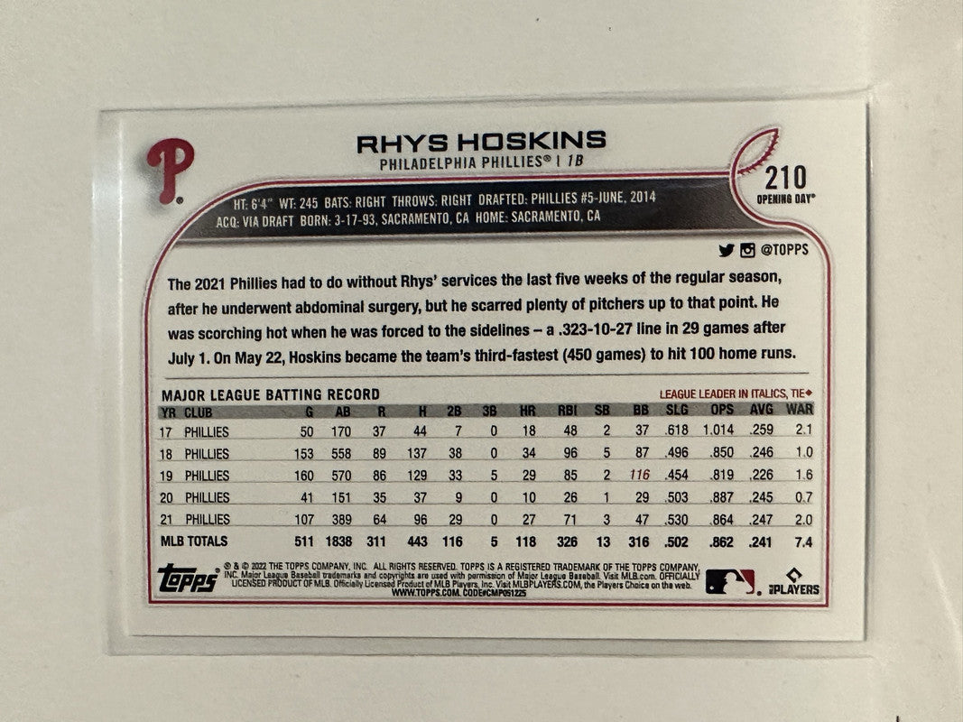 #210 Rhys Hoskins Philadelphia Phillies 2022 Topps Opening Day Baseball Card
