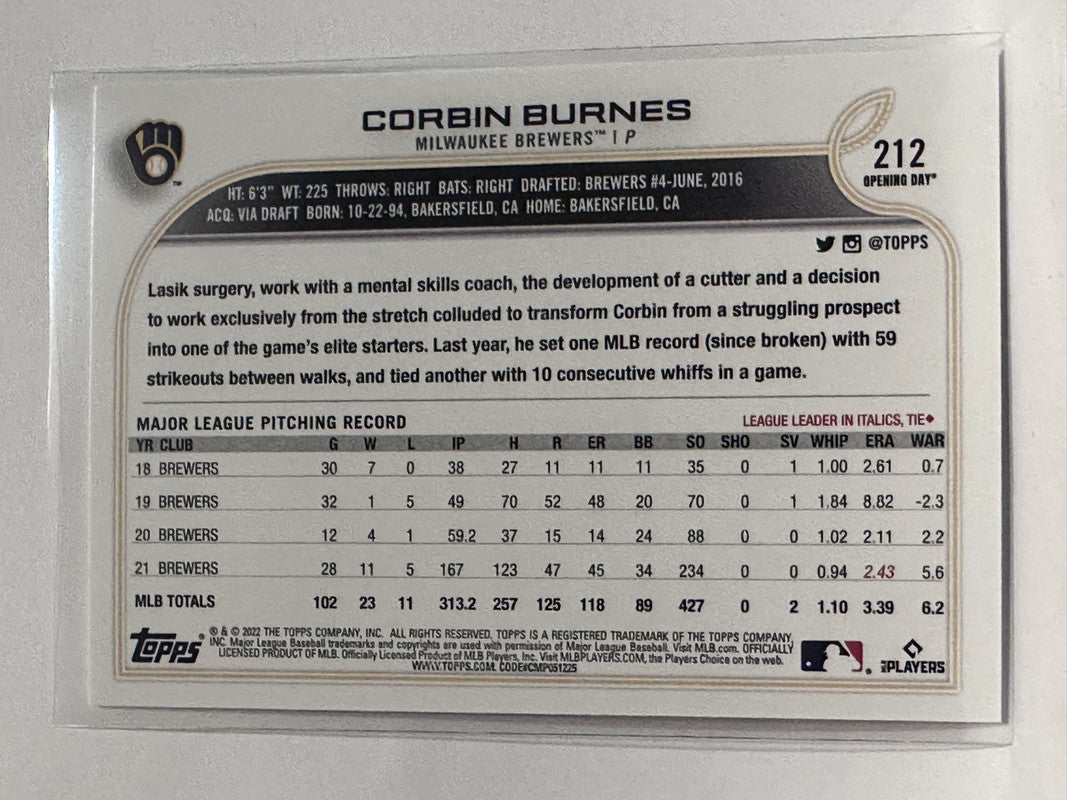 #212 Corbin Burnes Milwaukee Brewers 2022 Topps Opening Day Baseball Card