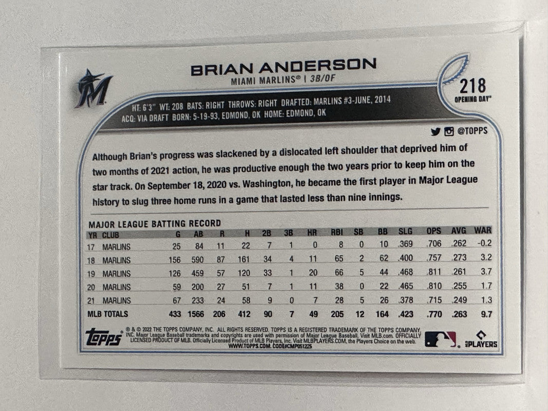 #218 Brian Anderson Miami Marlins 2022 Topps Opening Day Baseball Card