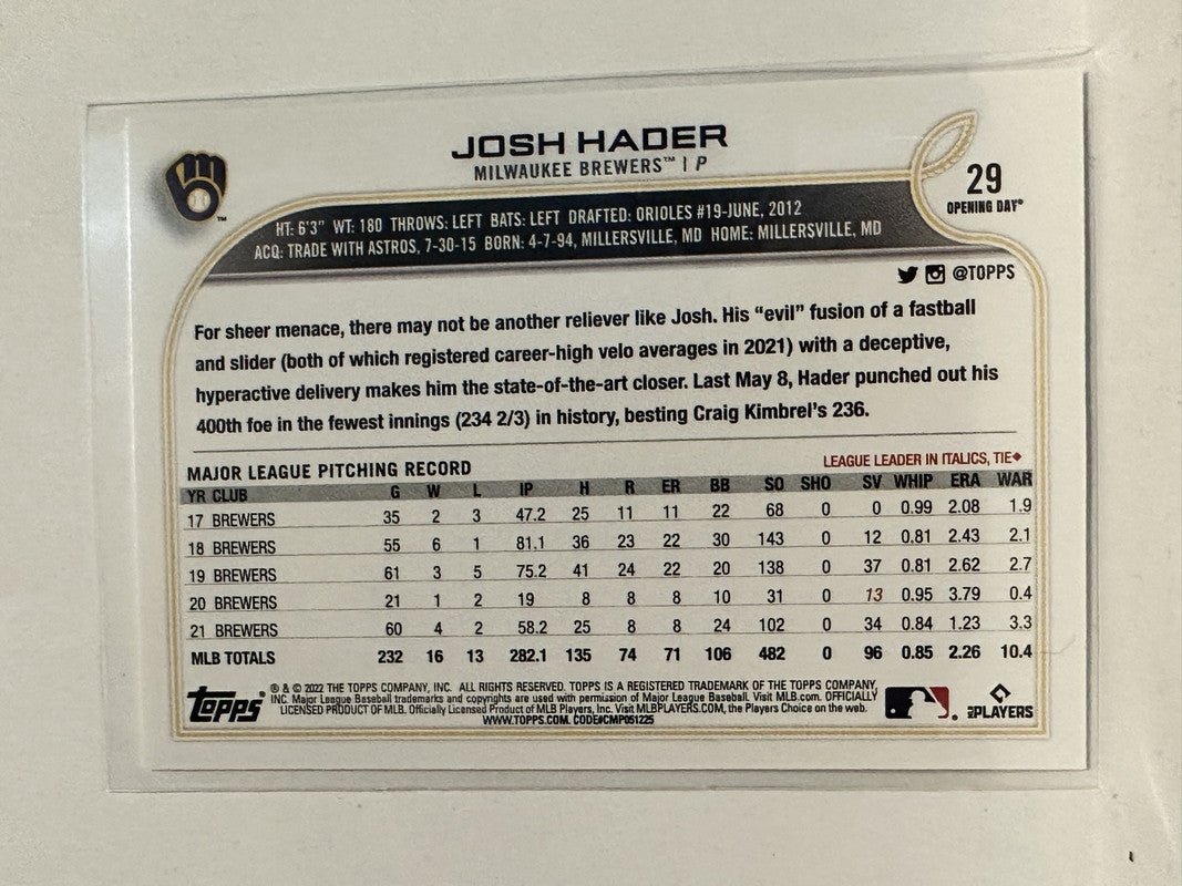 #29 Josh Hader Milwaukee Brewers 2022 Topps Opening Day Baseball Card