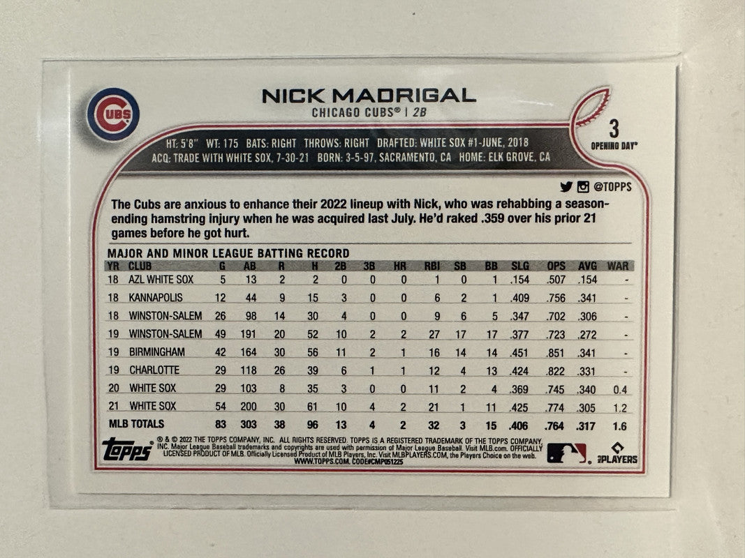 #3 Nick Madrigal Future Stars Chicago Cubs 2022 Topps Opening Day Baseball Card