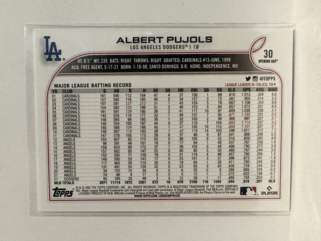 #30 Albert Pujols Los Angeles Dodgers 2022 Topps Opening Day Baseball Card
