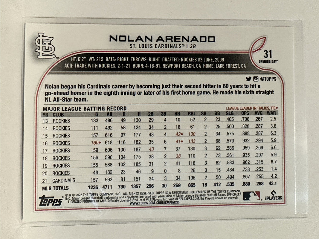 #31 Nolan Arenado St Louis Cardinals 2022 Topps Opening Day Baseball Card