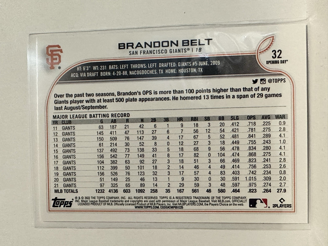 #32 Brandon Belt San Francisco Giants 2022 Topps Opening Day Baseball Card