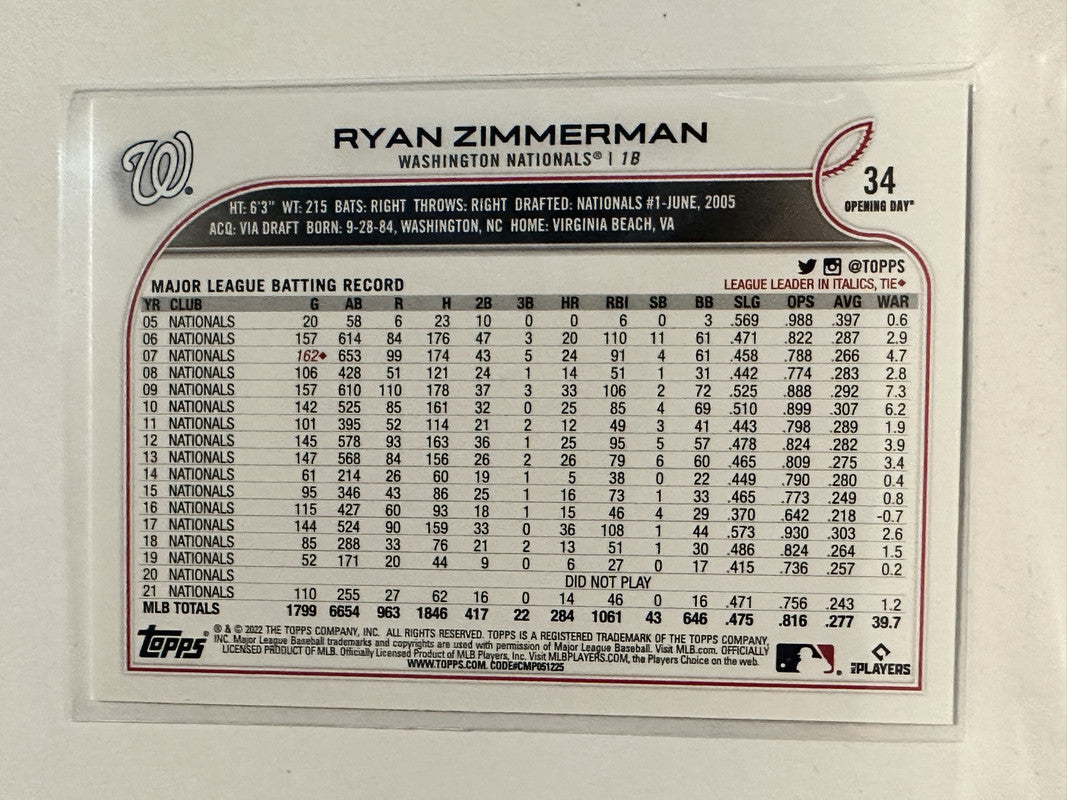 #34 Ryan Zimmerman Washington Nationals 2022 Topps Opening Day Baseball Card