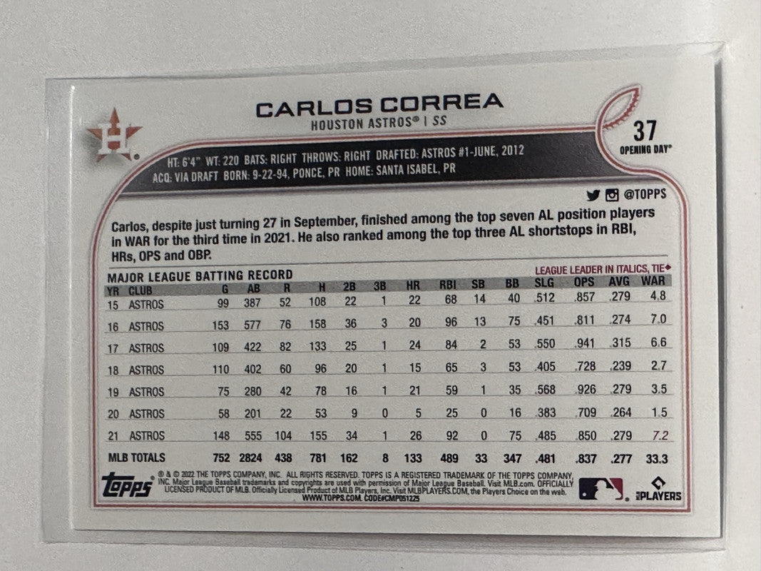 #37 Carlos Correa Houston Astros 2022 Topps Opening Day Baseball Card