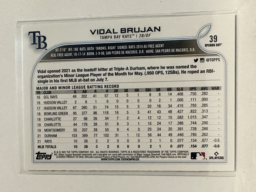#39 Vidal Brujan Rookie Tampa Bay Rays 2022 Topps Opening Day Baseball Card