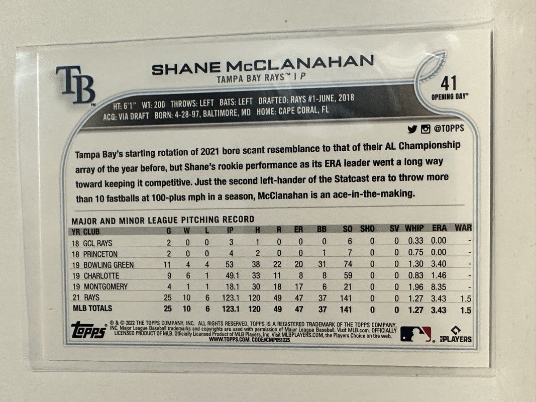 #41 Shane McClanahan Future Stars Tampa Bay Rays 2022 Topps Opening Day Baseball Card