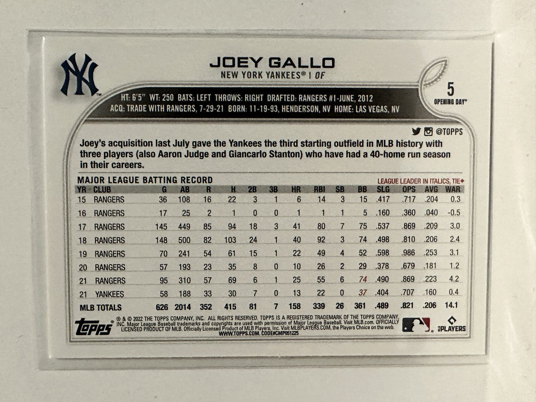 #5 Joey Gallo New York Yankees 2022 Topps Opening Day Baseball Card