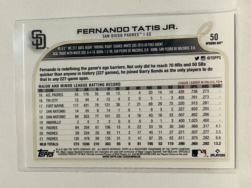 #50 Fernando Tatis Jr San Diego Padres 2022 Topps Opening Day Baseball Card