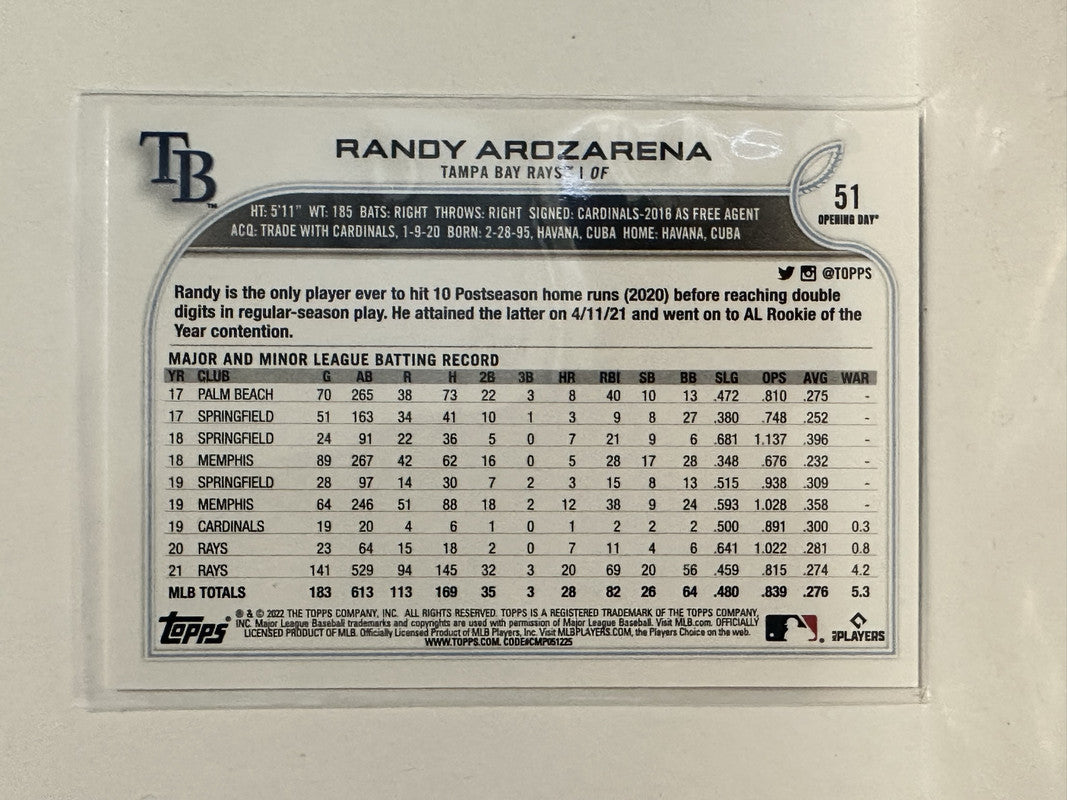 #51 Randy Arozarena All Star Rookie Tampa Bay Rays 2022 Topps Opening Day Baseball Card