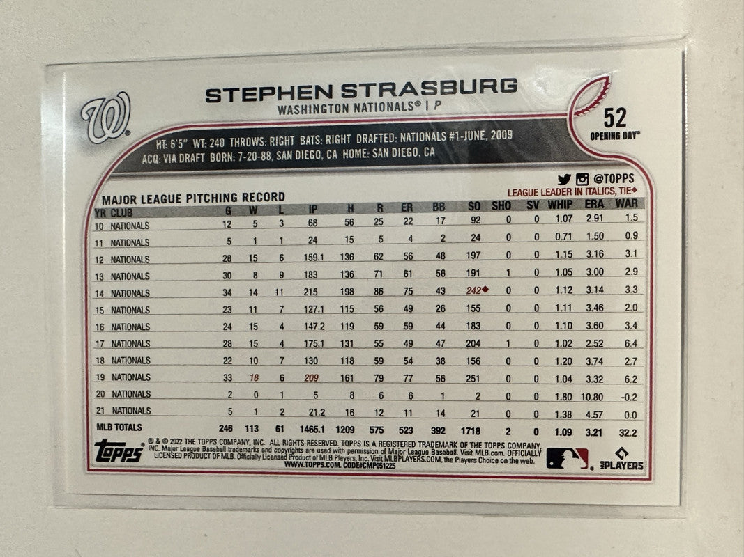 #52 Stephen Strasburg Washington Nationals 2022 Topps Opening Day Baseball Card