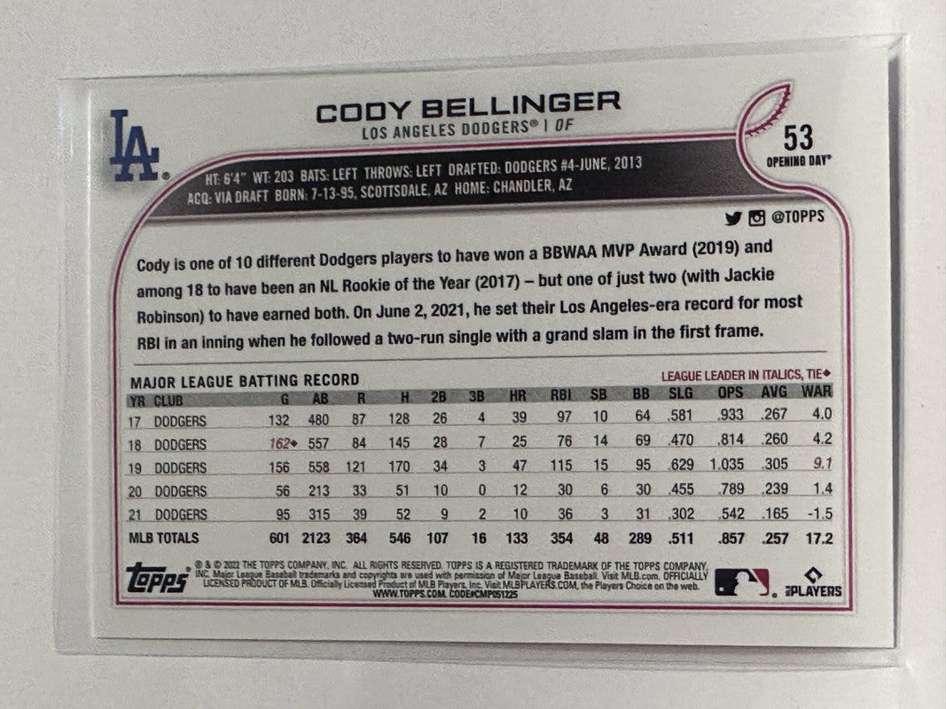 #53 Cody Bellinger Los Angeles Dodgers 2022 Topps Opening Day Baseball Card