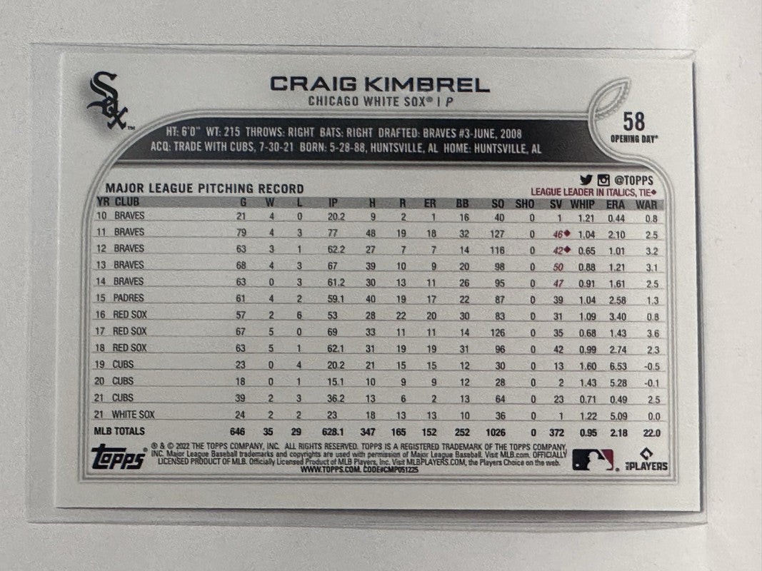 #58 Craig Kimbrel Blue Chicago White Sox 2022 Topps Opening Day Baseball Card