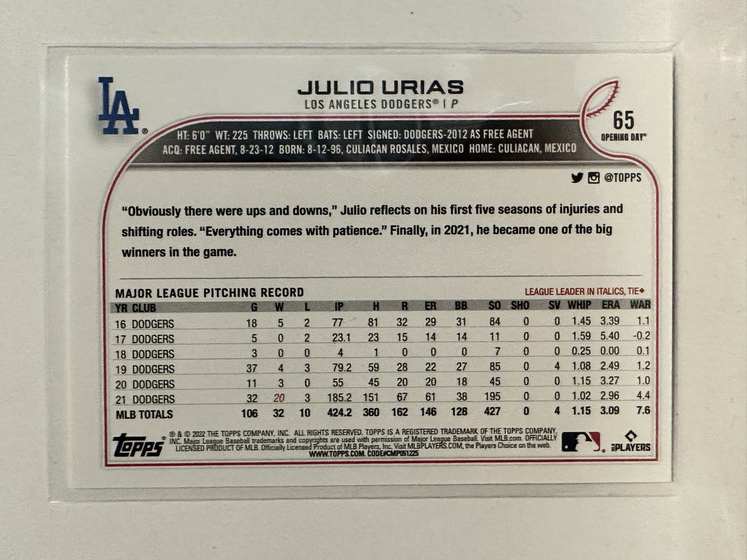 #65 Julio Urias Los Angeles Dodgers 2022 Topps Opening Day Baseball Card