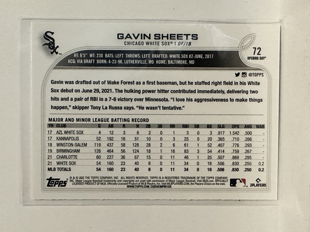 #72 Gavin Sheets Rookie Chicago White Sox 2022 Topps Opening Day Baseball Card