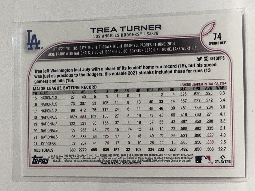 #74 Trea Turner Los Angeles Dodgers 2022 Topps Opening Day Baseball Card