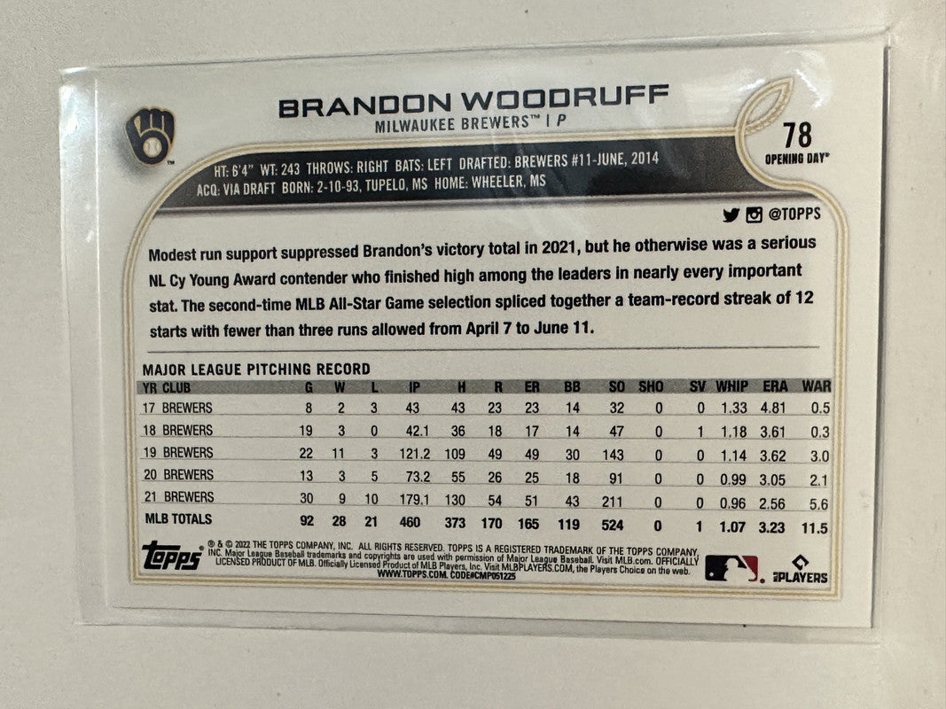 #78 Brandon Woodruff Milwaukee Brewers 2022 Topps Opening Day Baseball Card