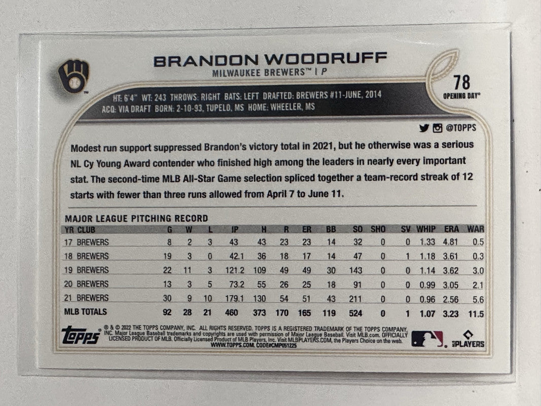#78 Brandon Woodruff Milwaukee Brewers 2022 Topps Opening Day Baseball Card