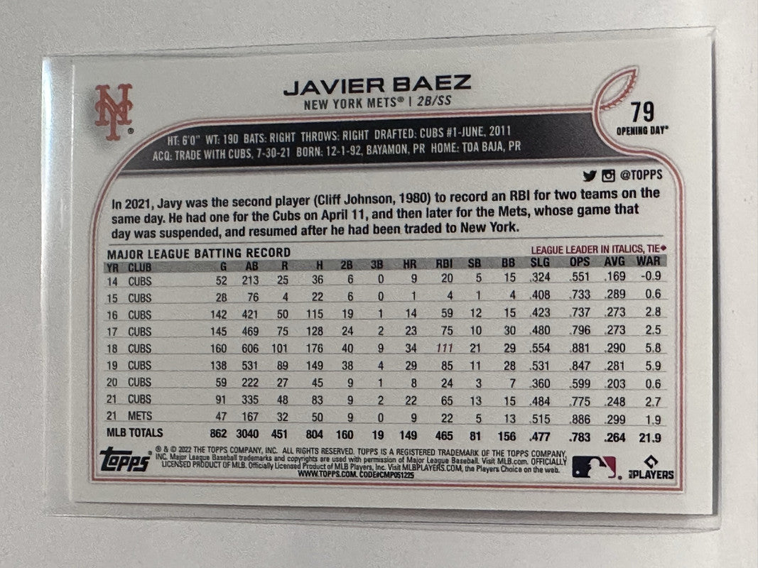 #79 Javier Baez New York Mets 2022 Topps Opening Day Baseball Card