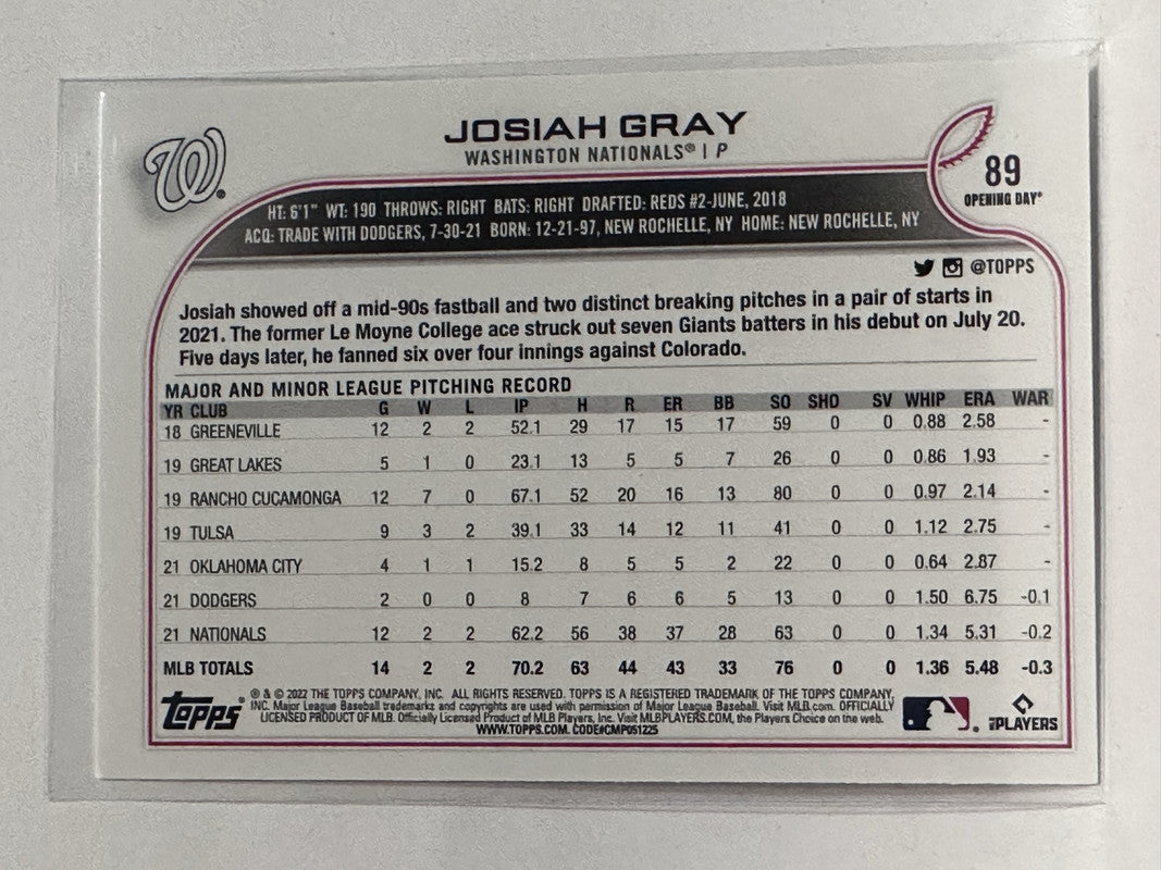 #89 Josiah Gray Rookie Washington Capitals 2022 Topps Opening Day Baseball Card