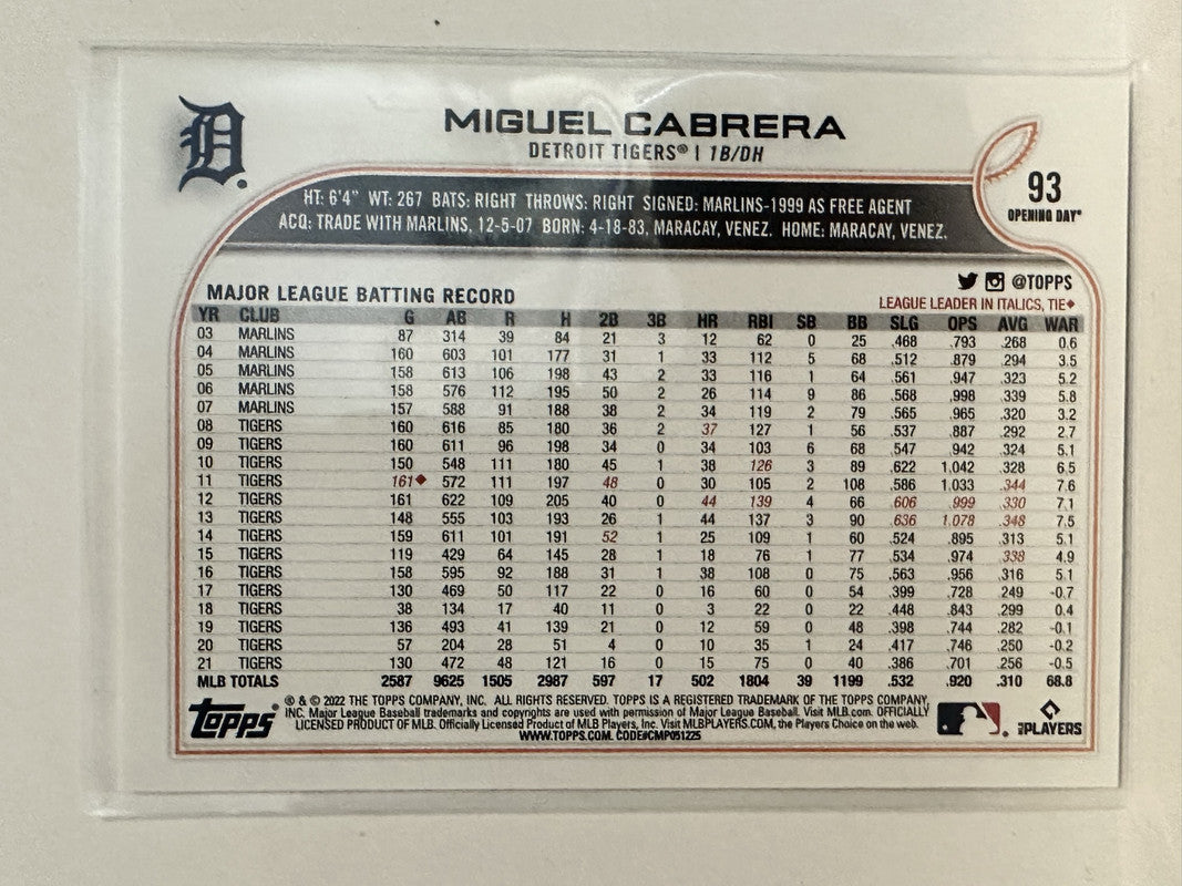 #93 Miguel Cabrera Detroit Tigers 2022 Topps Opening Day Baseball Card