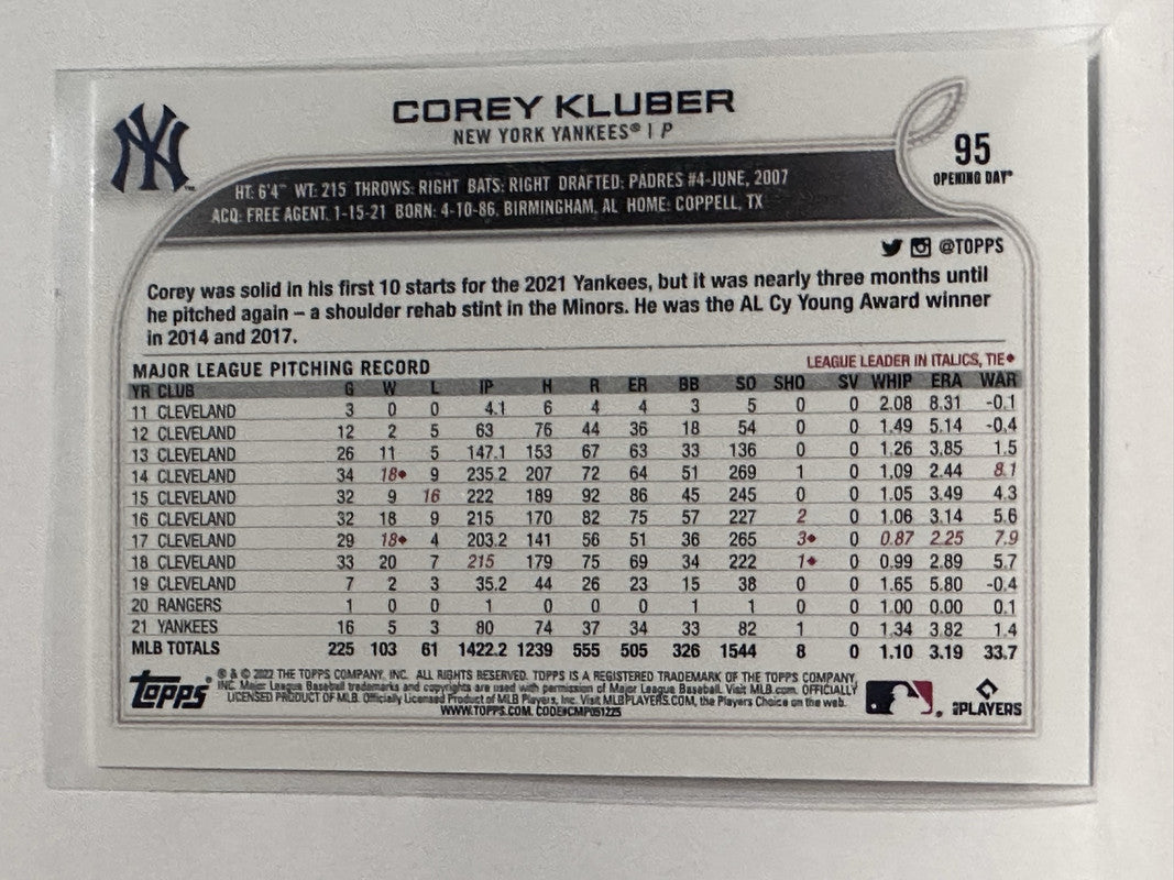 #95 Corey Kluber New York Yankees 2022 Topps Opening Day Baseball Card
