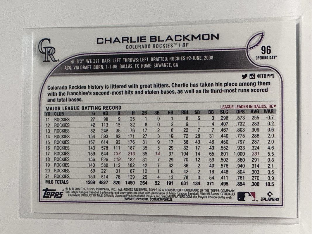 #96 Charlie Blackmon Colorado Rockies 2022 Topps Opening Day Baseball Card