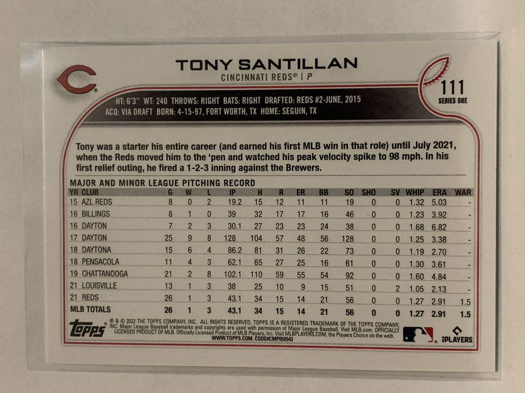 #111 Tony Santillan Rookie Cincinnati Reds 2022 Topps Series 1 Baseball Card MLB
