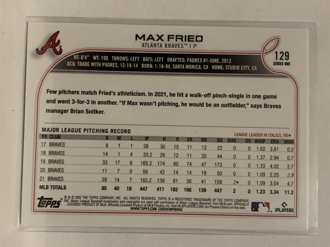 #129 Max Fried Atlanta Braves 2022 Topps Series 1 Baseball Card MLB