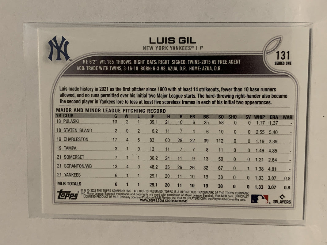 #131 Luis Gil Rookie New York Yankees 2022 Topps Series 1 Baseball Card MLB