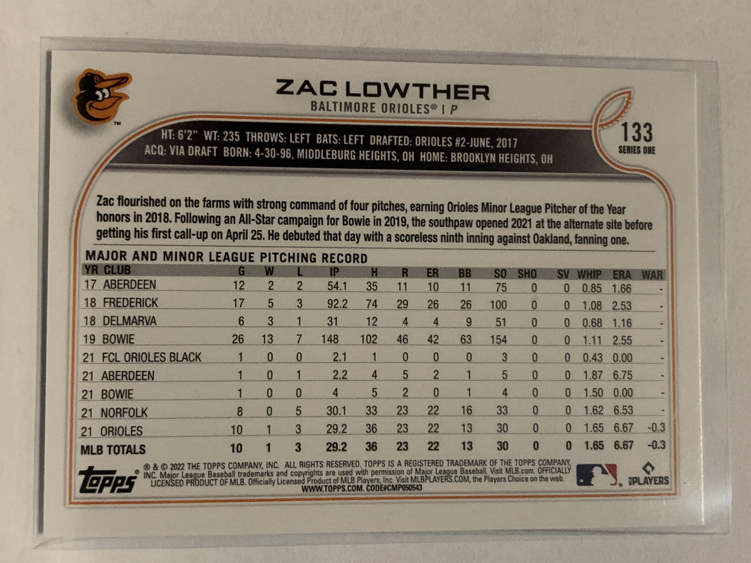 #133 Zac Lowther Rookie Baltimore Orioles 2022 Topps Series 1 Baseball Card MLB