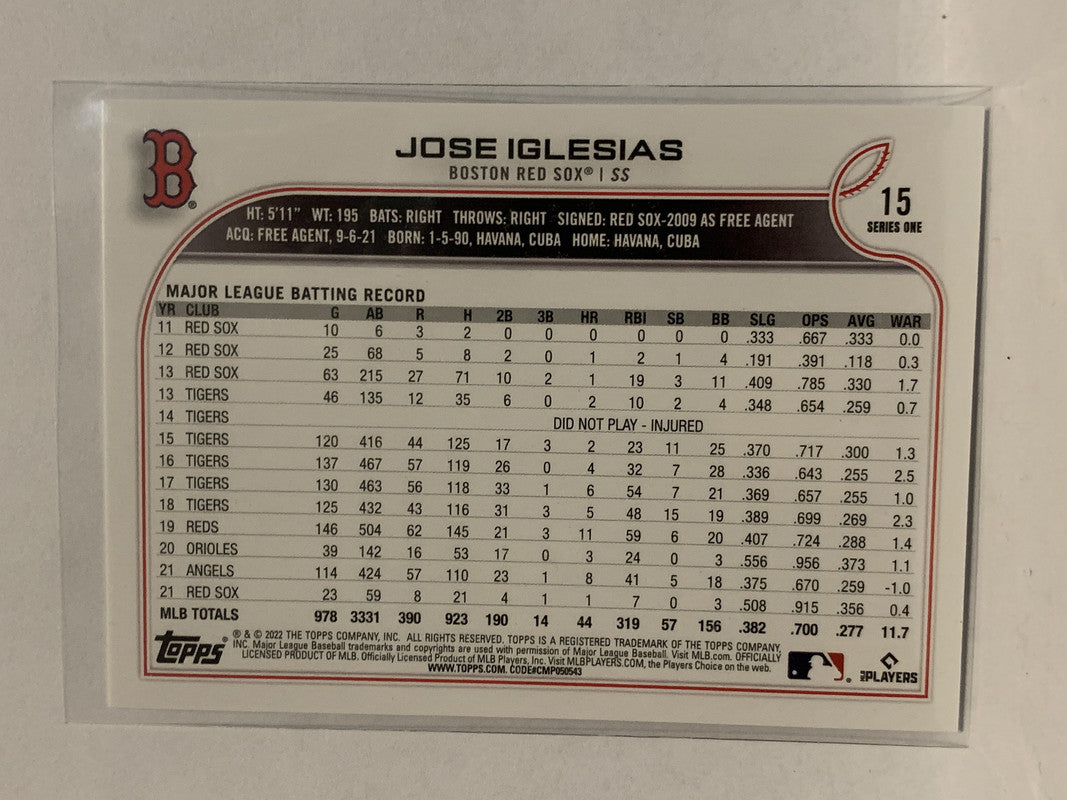 #15 Jose Iglesias Boston Red Sox 2022 Topps Series 1 Baseball Card MLB