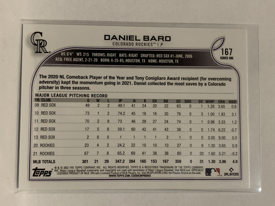 #167 Daniel Bard Colorado Rockies 2022 Topps Series 1 Baseball Card MLB