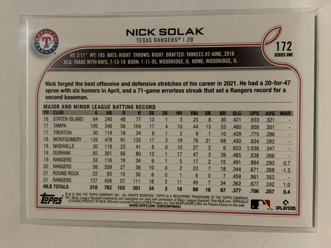 #172 Nick Solak Texas Rangers 2022 Topps Series 1 Baseball Card MLB