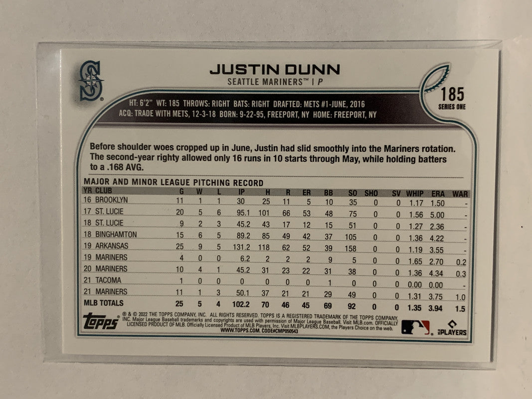 #185 Justin Dunn Seattle Mariners 2022 Topps Series 1 Baseball Card MLB