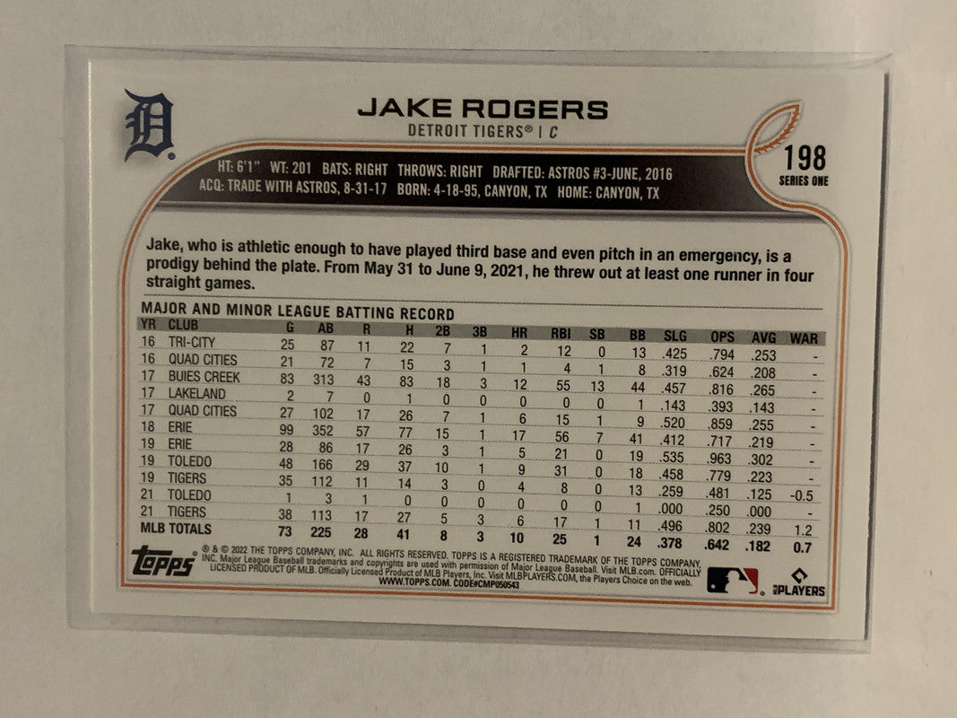 #198 Jake Rogers Detroit Tigers 2022 Topps Series 1 Baseball Card MLB