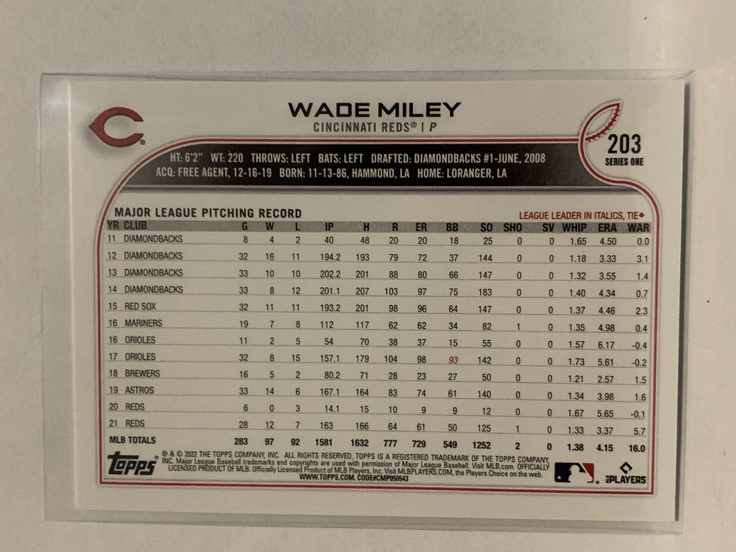 #203 Wade Miley Cincinnati Reds 2022 Topps Series 1 Baseball Card MLB