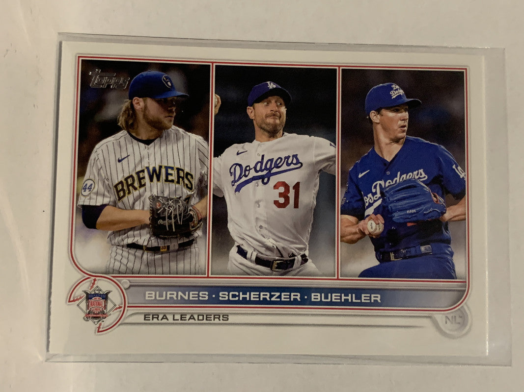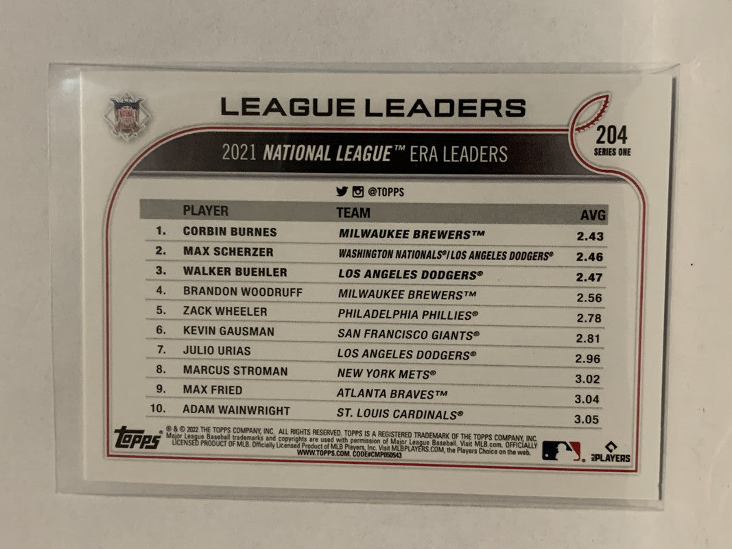#204 Burnes Scherzer Buehler ERA Leaders 2022 Topps Series 1 Baseball Card MLB