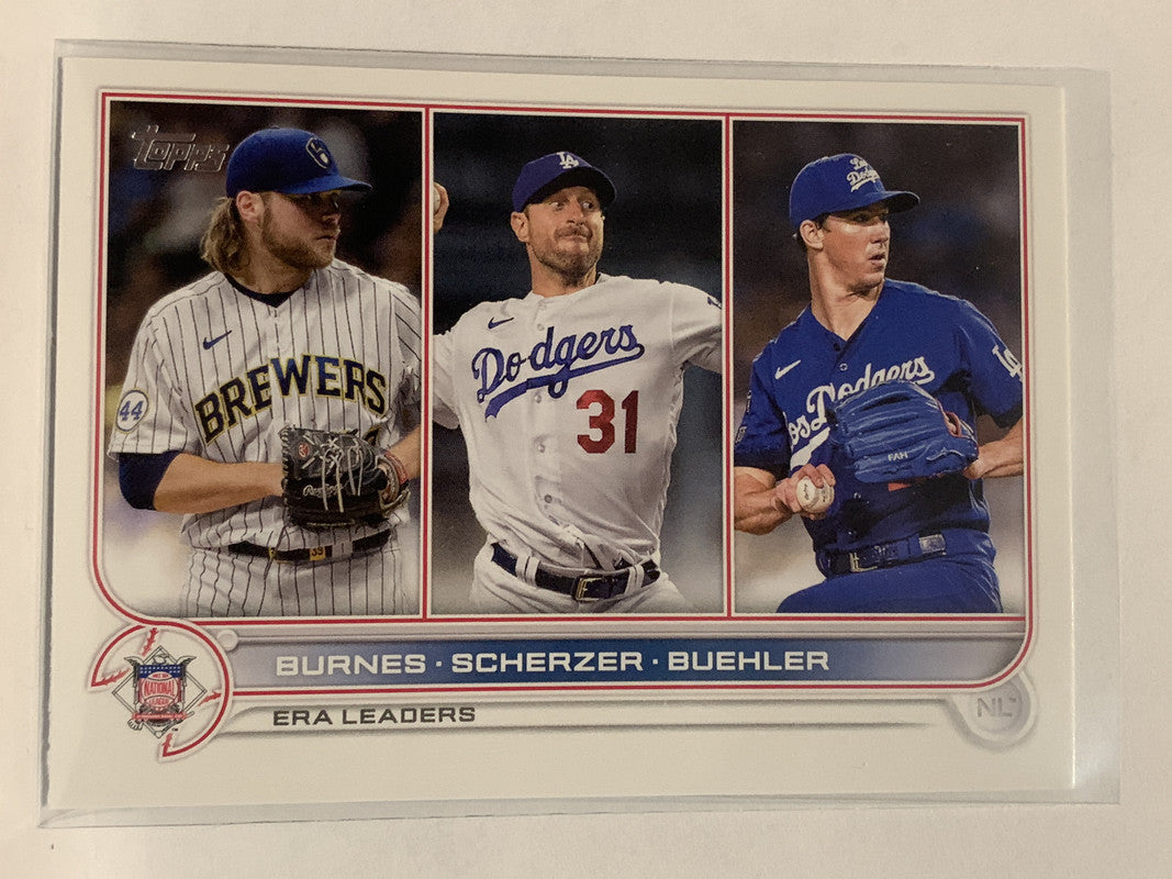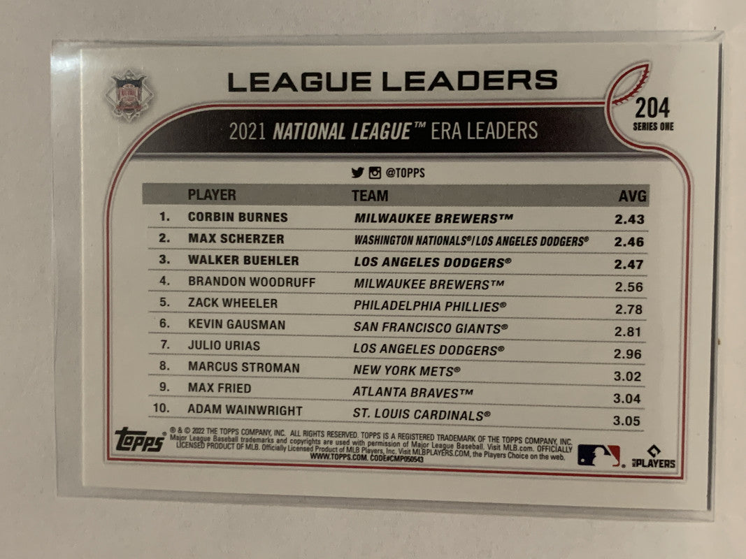 #204 Burnes Scherzer Buehler ERA Leaders 2022 Topps Series 1 Baseball Card MLB
