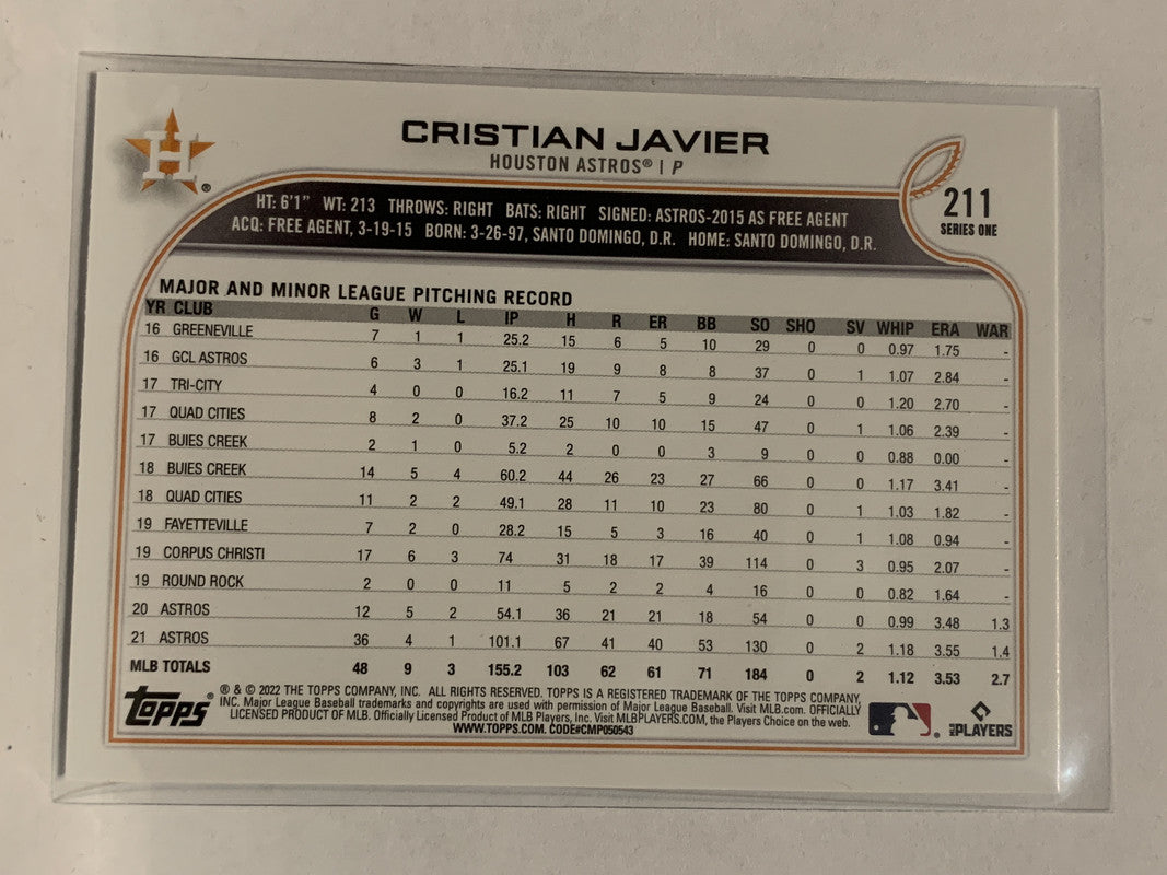 #211 Cristian Javier Houston Astros 2022 Topps Series 1 Baseball Card MLB