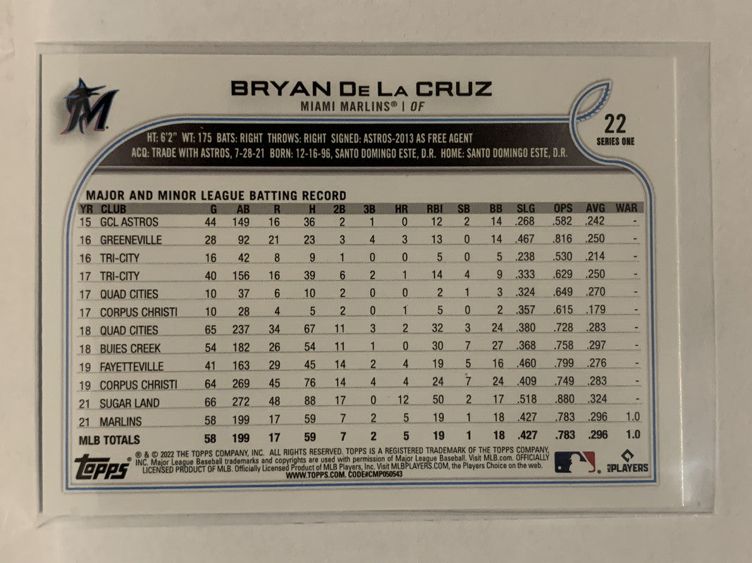 #22 Bryan De La Cruz Rookie Miami Marlins 2022 Topps Series 1 Baseball Card MLB