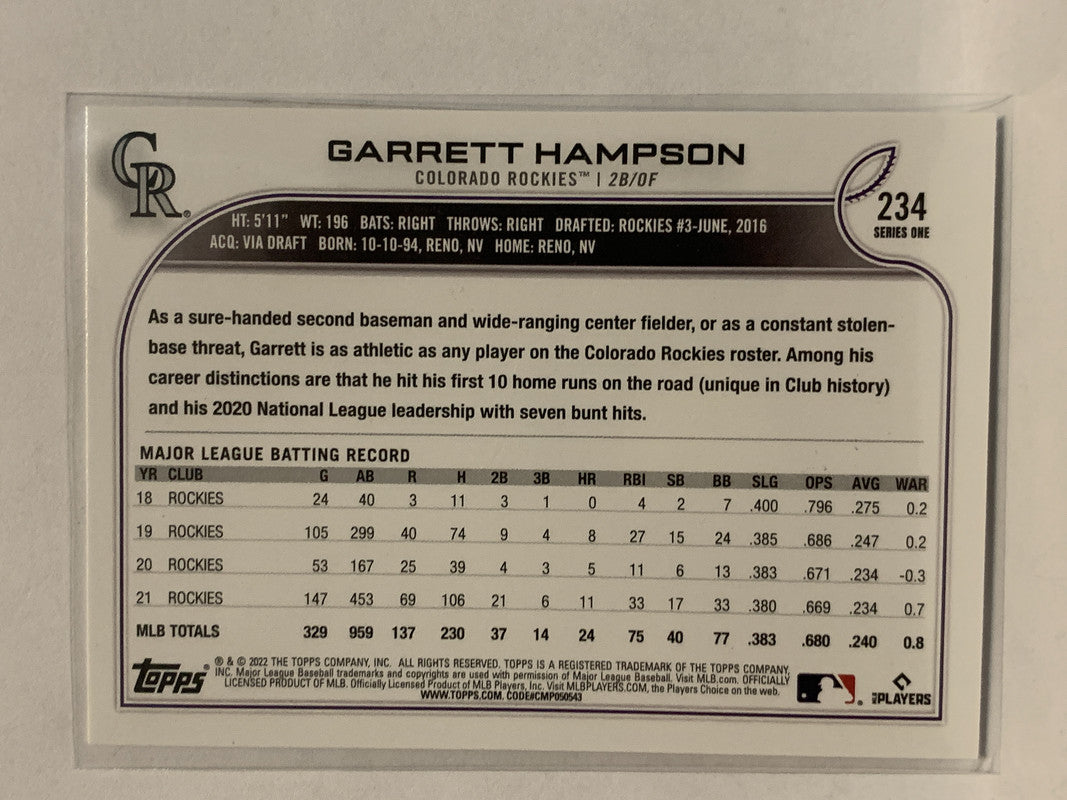 #234 Garrett Hampson Colorado Rockies 2022 Topps Series 1 Baseball Card MLB