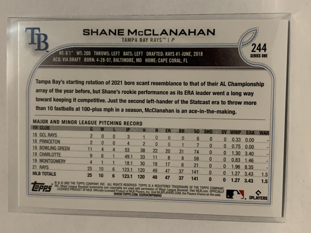 #244 Shane McClanahan Future Stars Rookie Rainbow Tampa Bay Rays 2022 Topps Series 1 Baseball Card MLB