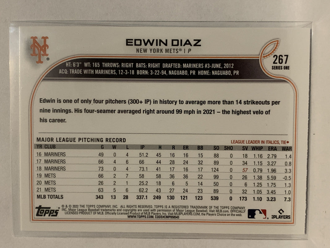 #267 Erwin Diaz New York Mets 2022 Topps Series 1 Baseball Card MLB
