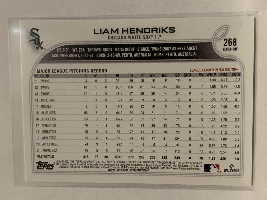 #268 Liam Hendriks Chicago White Sox 2022 Topps Series 1 Baseball Card MLB